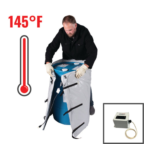 The Powerblanket BH55CONNECTG is a full wrap 55 gallon insulated drum heater utilizing GreenHeat Technology. Effective heating from ambient to 145°F with smart controller for pinpoint temperature control. Adjustable straps guarantee a perfect fit every time. Stop using hazardous band heaters and bulky warming ovens. Powerblanket takes the hassle out of heating your industrial materials and chemicals. Wrap it in a Powerblanket and you'll never use another band or immersion heater again. We guarantee it. Powerblanket drum and bucket heaters are more efficient and use considerably less energy than conventional band heaters. Test results show Powerblanket to be significantly more effective than band heaters at warming and insulating drums, buckets, pails, gas cylinders and IBC totes. Powerblanket is the fastest, easiest and most affordable method for heating and maintaining the temperature of your industrial materials.